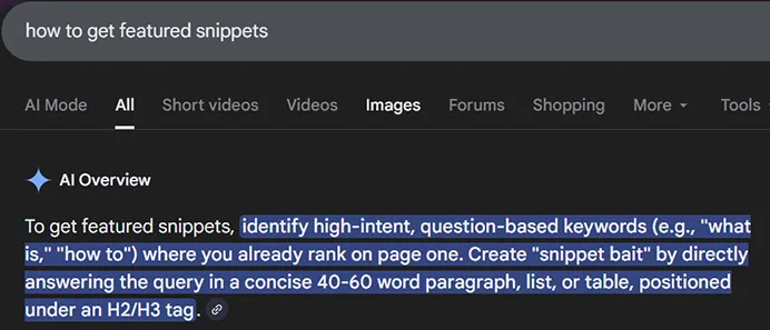 Paragraph snippets are the most common type. These typically answer “what,” “who,” “why,” and “how” questions with a brief text excerpt of 40-60 words. Google pulls a concise definition or explanation directly from your content.